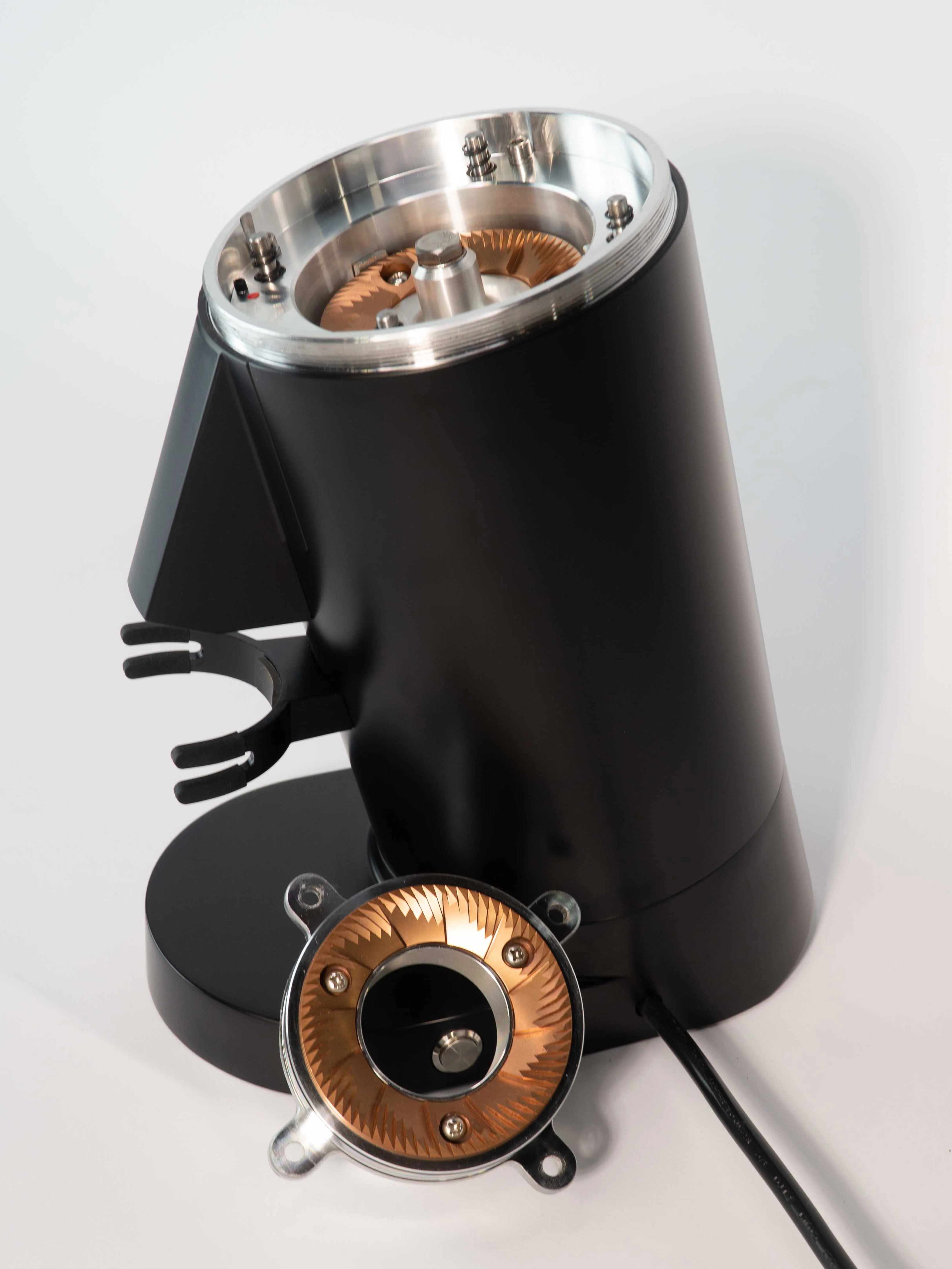 - 83 mm Red Titanium flat burrs tuned for balanced espresso body with clarity